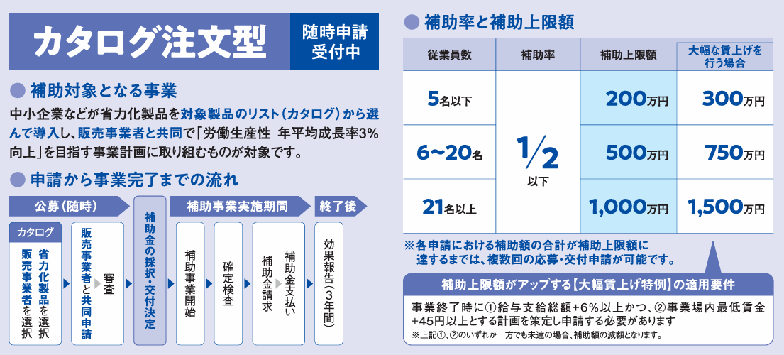 こうした特徴から、カタログ注文型は省力化投資の入口として利用しやすい形になっています。