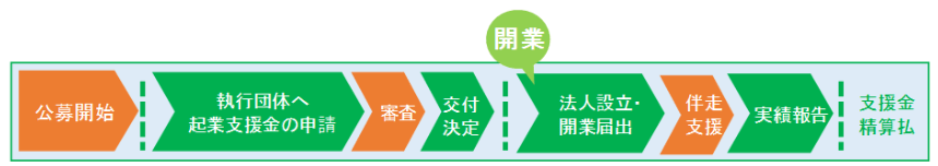 ポイントは『資金』と『伴走』の支援がセットになっていること。自治体(または自治体が選定した運営団体)が、計画の審査や立ち上げに向けた伴走支援を行い、起業等に必要な経費の一部を助成します。