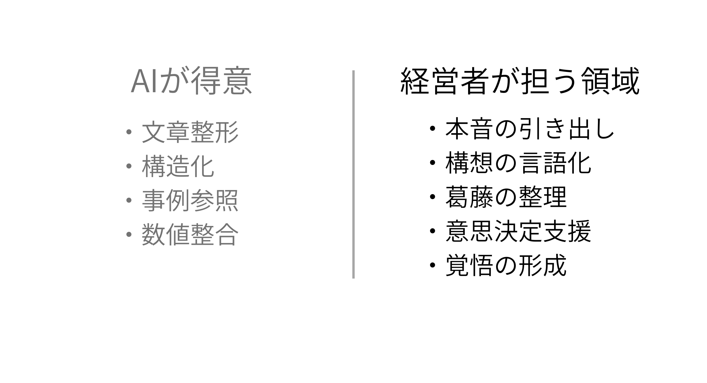 AIは論理を整えますが、戦略を選び、責任を引き受けるのは経営者です。